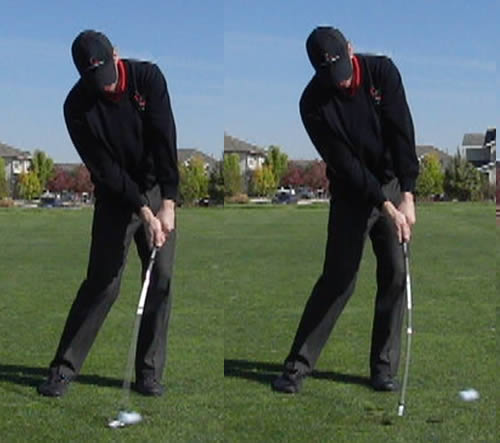 In the image on the left, you can see that this student was very "flippy" at impact, and his shaft was actually leaning AWAY from the target at impact. With some work on my impact drills, his impact position improved dramatically by his second lesson.