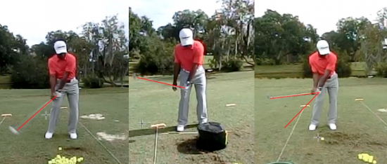 In the center photo, notice what this student accomplished by doing that — with the left hand at the right thigh, the club head is actually above a line parallel to the ground, indicating big lag!