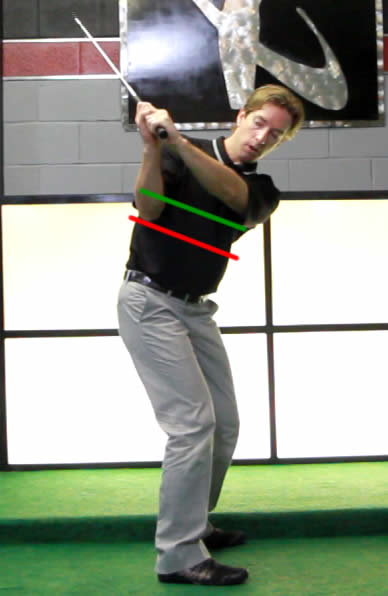 I define this by the height of the right elbow in relation to the pectoral muscle. The red line represents the elbow and the green represents the approximate base of the chest. It’s clear that my elbow is well below my chest and elevated minimally during the backswing to achieve this position.