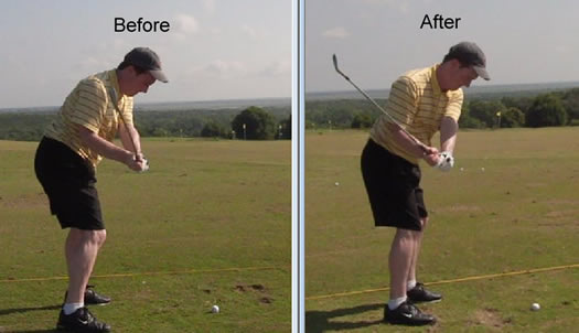 After only a few minutes of teaching this golfer my secret 2″ shoulder blade glide, look at the difference in his takeaway – it’s HUGE!