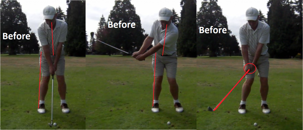 During his backswing he was letting his hips shift to the right. This caused his upper body to get too vertical, even slightly leaning toward the target as he finished his backswing.